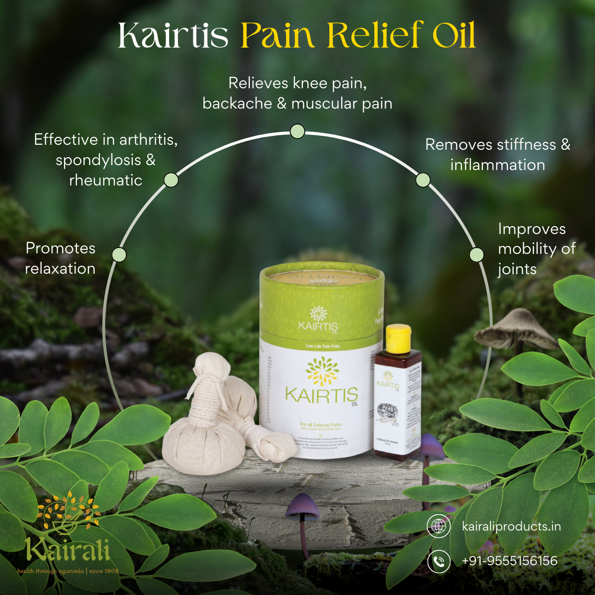 Kairtis is an excellent pain reliever based on panchakarma treatment with the goodness of Ayurvedic massage potli. It effectively gives relief from knee pains, joint pains, rheumatic pains, frozen shoulder, muscle cramps, backache, neuro-muscular pain and swelling. Kairtis oil provides long-lasting relief that lets you live a pain-free lifestyle.